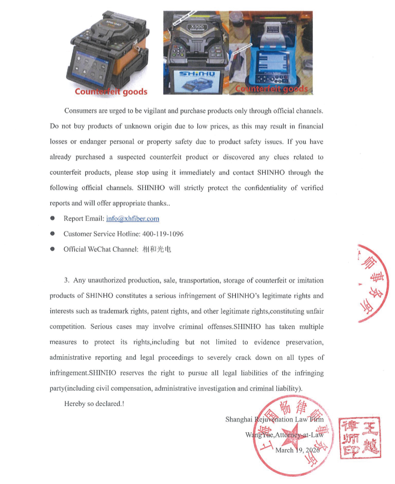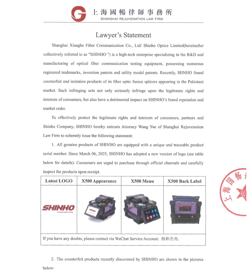 Déclaration d'un avocat concernant la contrefaçon de la soudeuse à fibre optique SHINHO X-500 sur le marché pakistanais.
